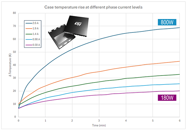 該GaN開關管可以安全地輸出約 800 W 的功率,而不會發生熱失控。溫升 Δt 小于 70 °C,在達到 150 °C 的最高工作結溫 (TJmax)之前,有充足的安全裕量。