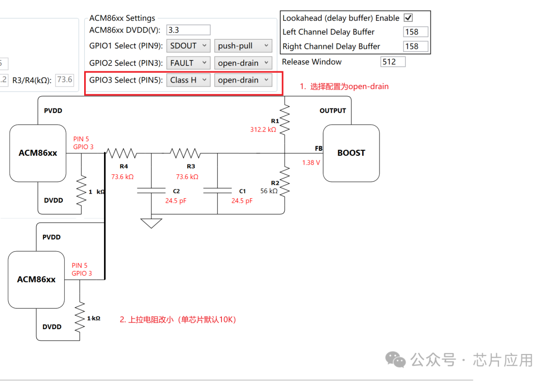 如果是數(shù)字功放,以ACM8625為例,將選擇作為CLASSH的IO口并聯(lián)就可以,共用一組RC濾波,電路示意圖如下。