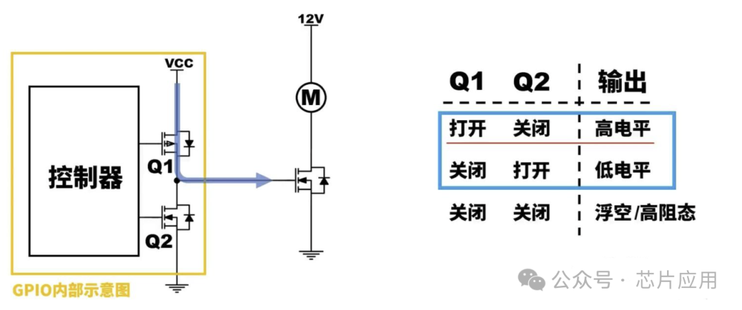 如下圖,當(dāng)我們外接一個(gè) MOS 管時(shí),輸出高電平,電流流出去給外面的 MOS 管的柵極充電,所以這個(gè)過程稱為。把電流推出去。