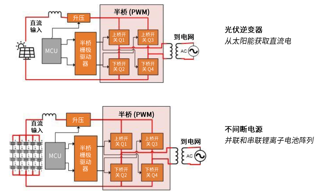 這里是一些常見的應用和框圖元素。 它們都使用半橋將交流電輸送到電網。