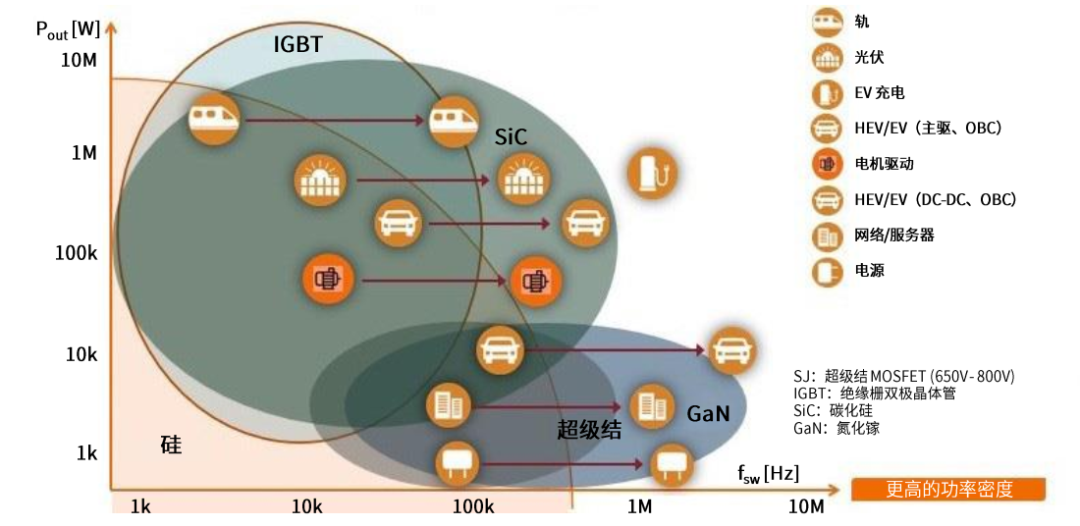 下圖顯示了各種高功率主流應用優先考慮使用的開關。紅色箭頭顯示, 許多功率超過 ~10kW 的應用正在從 IGBT 轉向更快的碳化硅 (SiC) 開關。 更快速的開關可帶來更高的功率密度。
