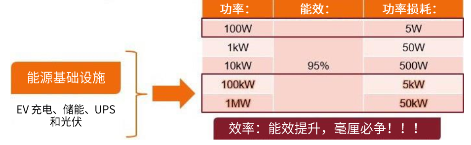 對于傳統的小功率產品 (~100 W), 95% 的效率是可以接受的。對于使用數百千瓦或兆瓦的高功率應用而言 , 管理功耗是一項更為復雜的設計工作, 因為效率的每千分之一都很重要。