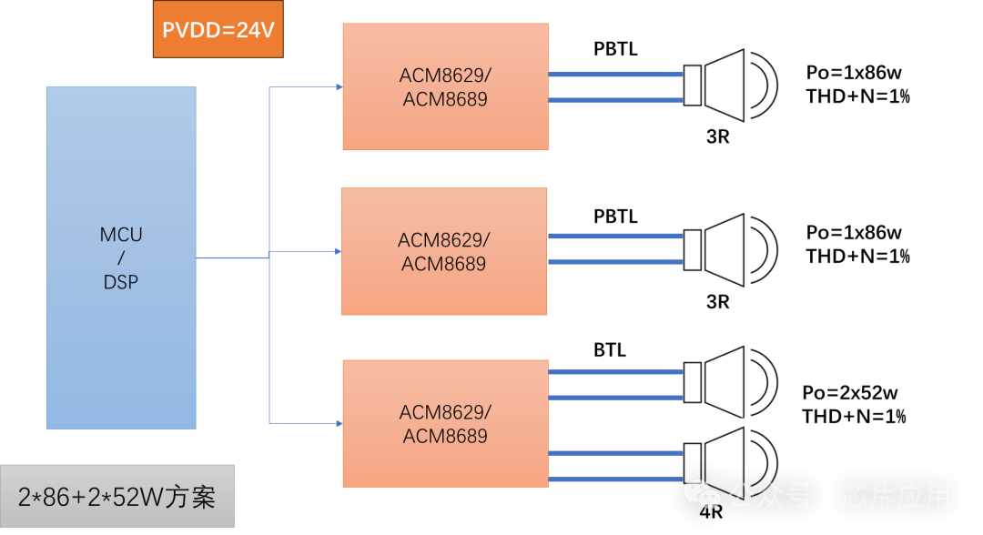 在party-speaker應(yīng)用端,常見的有2.1方案和2.2方案。2.2方案中如果追求性能,推薦的做法是用3顆數(shù)字功放,方便做電子分頻。例如下圖方案,就是適合260W總功率以下的推薦方案。