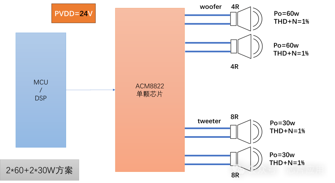 CM8822應(yīng)用靈活,可以配置為2.1聲道,8822的特點是工作電壓寬,PVDD可以在4.5-30V電壓范圍。為了更好的動態(tài),可以將工作電壓設(shè)為28V,做1*115W+2*57W的組合應(yīng)用。