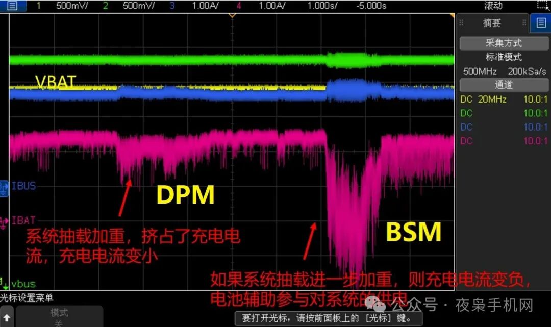 如果手機系統的抽載特別重,即使把電池的充電電流降為零(Q4管關閉),仍然不能滿足系統抽載時,系統就會進入BSM(battery Supplement Mode)模式。此模式下,電池會轉換為放電狀態,然后與充電器一起給系統供電。