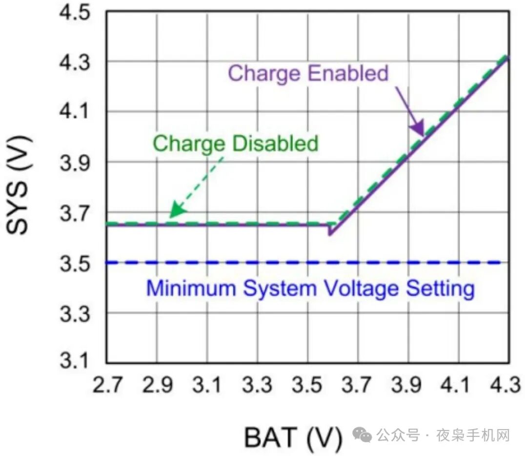 如下圖,如果VBAT低于設定的最小系統電壓時,BATFET將會運行在線性模式(LDO mode),此時充電IC輸出的Vsys電壓將會比設定的最小系統電壓高150mV;當VBAT上升到比最小系統電壓高時,BATFET將完全導通(full on mode),此時充電IC輸出的Vsys電壓被調節在比電池電壓高70mV左右的一個電壓。