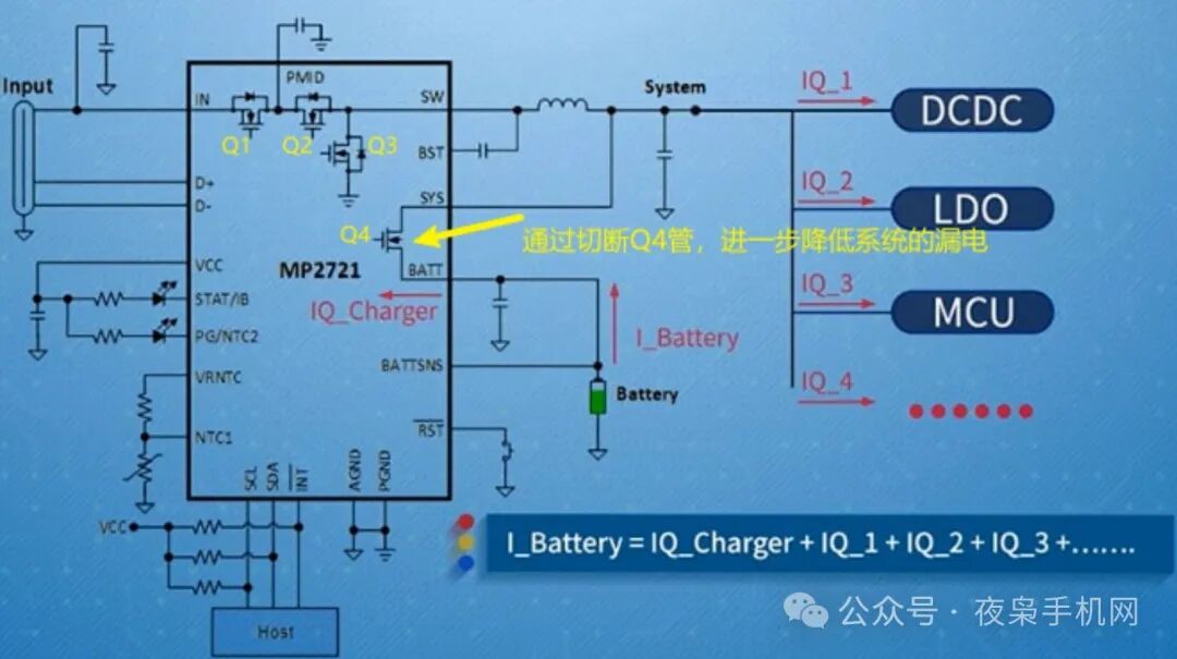 以MPS家的某buck charger IC為例,其未開啟運輸模式時待機功耗為44μA ,而開啟運輸模式后待機功耗只有8.5μA ,而這就是通過關斷Q4管實現的。