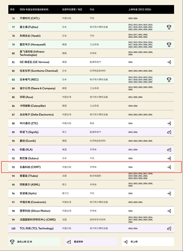 據全球知識產權與科技信息分析權威機構科睿唯安(Clarivate)發布的2026年度“全球百強創新機構(Top 100 Global Innovators 2026)”榜單,中國存儲芯片龍頭企業長鑫科技憑借在DRAM領域的領先研發能力與扎實專利儲備首次躋身“全球百強創新機構”榜單,也是此次上榜的7家中國大陸企業中,唯一一家半導體存儲企業。