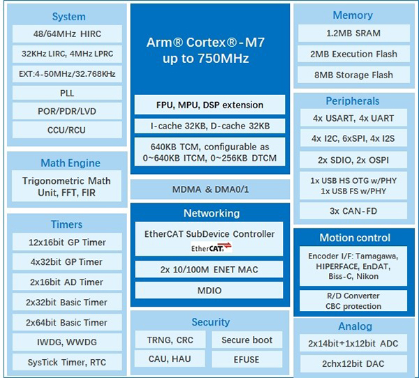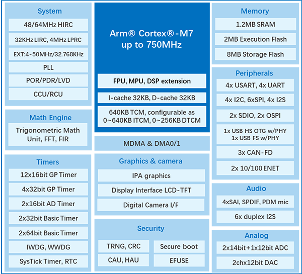 GD32H78E/77E、GD32H789/779系列MCU均基于性能強悍的Cortex®-M7內核,主頻高達750MHz。該系列芯片擁有超高存儲配置,最高可支持2MB Execution Flash與8MB Storage Flash,并搭載1.2MB的SRAM,更特別配備高達640KB大容量緊耦合內存(TCM),實現CPU同頻運行,指令與數據的零等待執行。無論是高實時任務、復雜算法還是密集型數據處理,這一革新架構可讓算力持續釋放,系統響應更快、執行更穩。