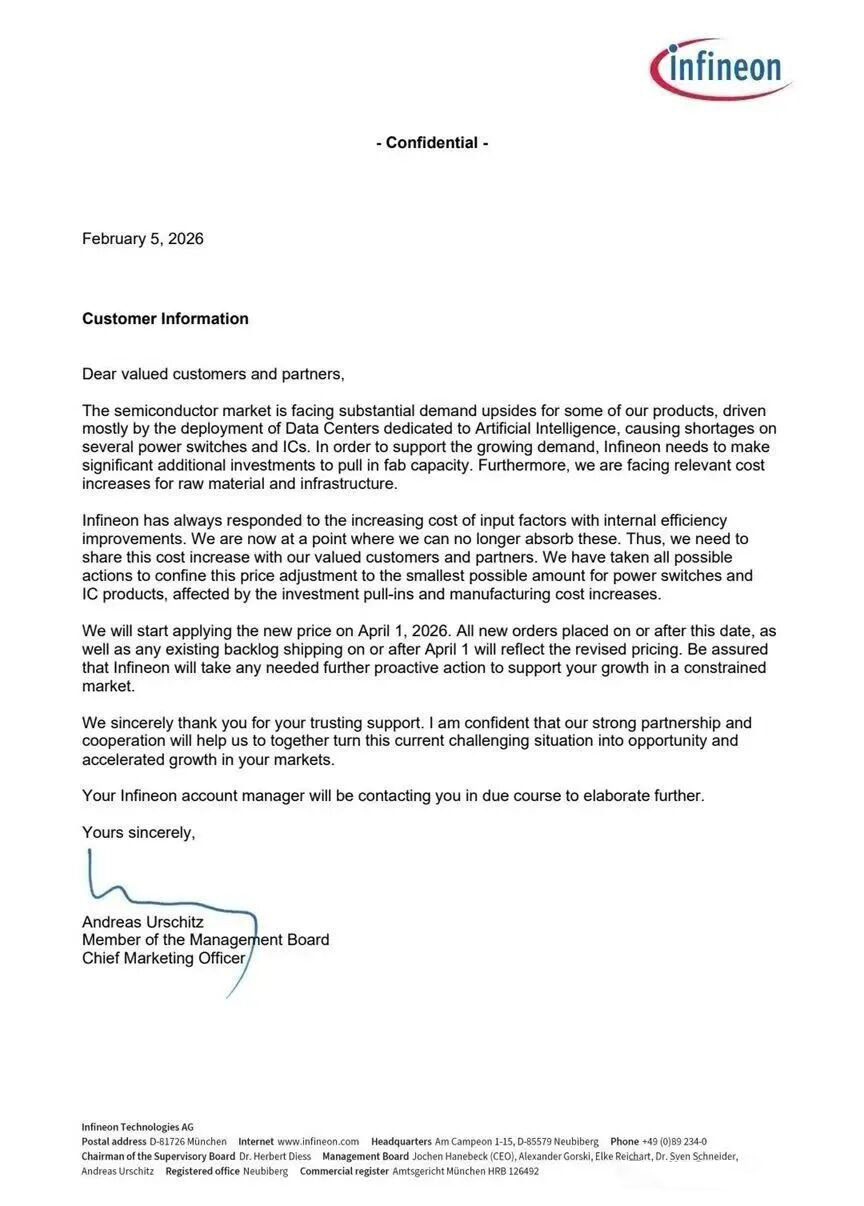 2月5日,汽車芯片大廠英飛凌向客戶發出通知稱,由于功率開關與相關芯片供給持續吃緊,以及原材料與基礎設施成本攀升,公司將自2026年4月1日起對這部分產品價格進行上調。