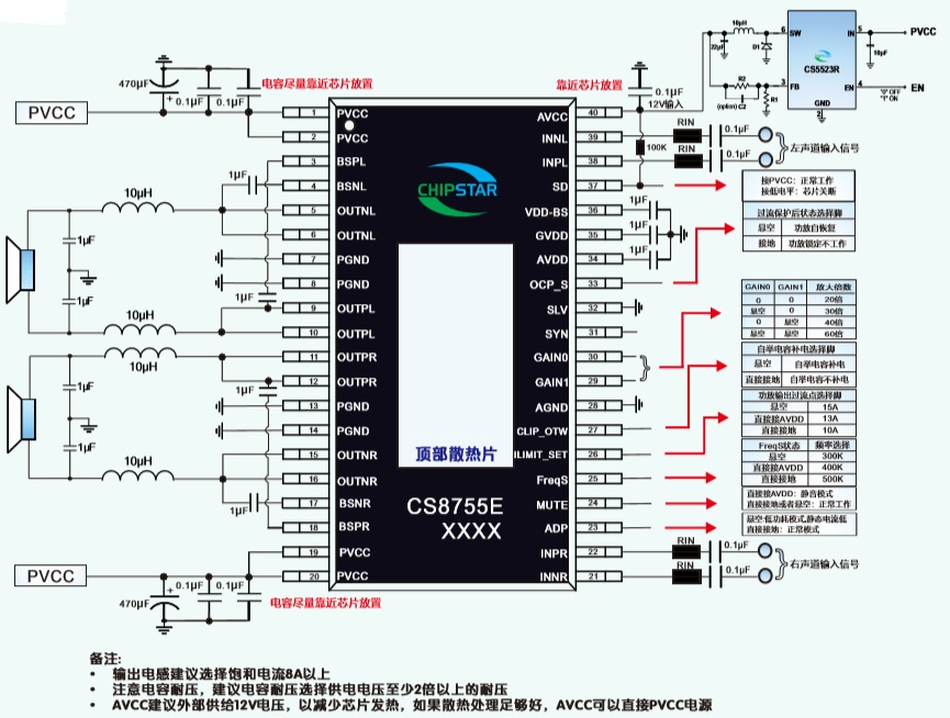 CS8755E內(nèi)置了過流保護(hù),短路保護(hù)和過熱保護(hù),有效的保護(hù)芯片在異常的工作條件下不被損壞。