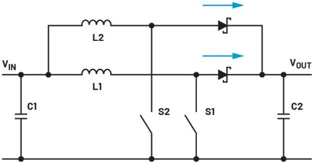 圖2.一種兩相升壓轉(zhuǎn)換器拓撲結(jié)構(gòu),通過兩條路徑分配功率以提升轉(zhuǎn)換效率。