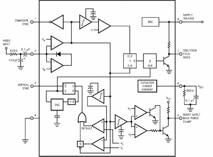 芯片也可以用于非標準或者行頻速度更快的視頻信號。標準視頻信號的場脈沖輸出開始于輸入信號的場脈沖沿,而當輸入的是非標準視頻信號時,場脈沖輸出在特定延遲后發生。