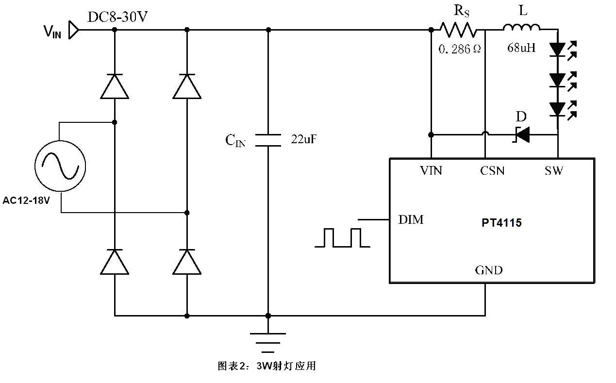 PT4115是一款連續電感電流導通模式的降壓恒流源,用于驅動一顆或多顆串聯LED。PT4115輸入電壓范圍從8伏到30伏,輸出電流可調,最大可達1.2安培。根據不同的輸入電壓和外部器件,PT4115可以驅動高達數十瓦的LED。PT4115 內置功率開關,采用高端電流采樣設置LED平均電流,并通過DIM引腳可以接受模擬調光和很寬范圍的PWM調光。當DIM的電壓低于0.3伏時,功率開關關斷,PT4115進入極低工作電流的待機狀態。 PT4115采用SOT89-5封裝。