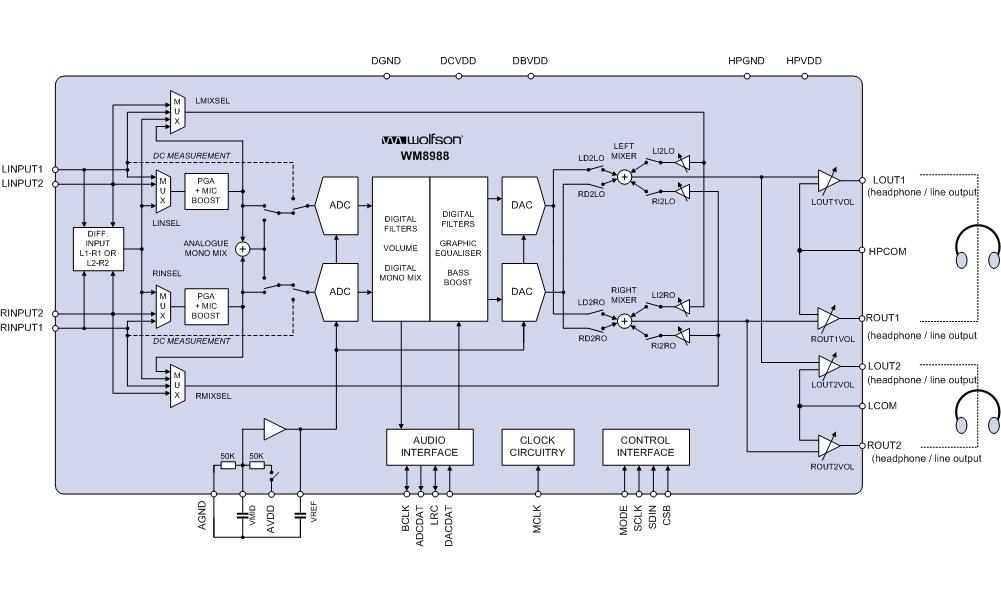 WM8988是一款低功率,高品質(zhì)的立體聲編解碼器,用于設(shè)計(jì)便攜式數(shù)字音頻。該器件集成了完整的接口,2個(gè)立體聲耳機(jī)或線路輸出端口。外部元件的需求大幅減少,因?yàn)闆]有單獨(dú)的耳機(jī)放大器需求。先進(jìn)的片上數(shù)字信號處理執(zhí)行圖形均衡器,3 - D音效增強(qiáng)為麥克風(fēng)或線路輸入自動(dòng)電平控制。WM8988可作為主機(jī)或從機(jī),與各主時(shí)鐘頻率,包括12或?qū)τ?/span>USB設(shè)備,或者像12.288MHz和24.576MHz的標(biāo)準(zhǔn)256fs速率24MHz的。不同,如96kHz,48kHz時(shí),44.1kHz的是產(chǎn)生于無需外部PLL時(shí)鐘直接需要掌握的音頻采樣率。 WM8988運(yùn)行的電源電壓下降到1.8V,其數(shù)字內(nèi)核可以在電壓低至1.42v運(yùn)作,以節(jié)省電源,以及所有供應(yīng)最大為3.6伏特。芯片的不同部分也可以通過軟件控制關(guān)機(jī)。WM8988采用QFN-28封裝,是手持和便攜式系統(tǒng)的理想選擇。