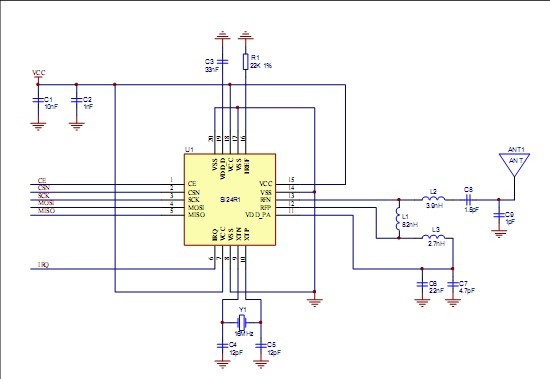 Si24R1是一款新型單片射頻收發器件,工作于2.4 GHz~2.5 GHz ISM頻段。內置頻率合成器、功率放大器、晶體振蕩器、調制器等功能模塊,并融合了增強型ShockBurst技術,其中輸出功率和通信頻道可通過程序進行配置。Si24R1功耗低,在以-6 dBm的功率發射時,工作電流也只有9 mA;接收時,工作電流只有12.3 mA,多種低功率工作模式(掉電模式和空閑模式)使節能設計更方便。Si24R1管腳兼容NRF24L01。