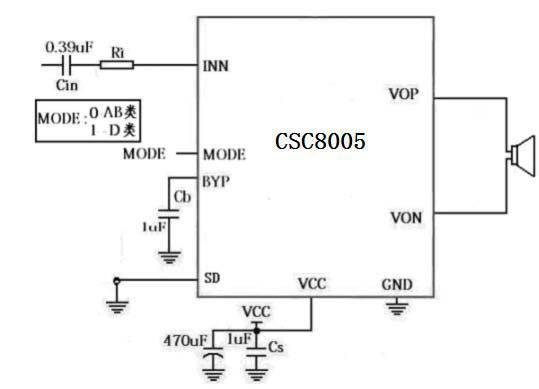 CSC8005是一款無FM 干擾,5.5W(2Ω負(fù)載),AB/D 類可選式功率放大器。5V 工作電壓時,最大驅(qū)動功率為5.5W(2Ω,BTL 負(fù)載,THD<10%),音頻范圍內(nèi)總諧波失真小于1%(20Hz—20KHz)。CSC8005 的應(yīng)用電路簡單,只需極少數(shù)外圍器件。CSC8005輸出不需要外接耦合電容或上舉電容和緩沖網(wǎng)絡(luò)。CSC8005采用ESOP8 封裝,特別適合用于小音量、小體積的便攜系統(tǒng)中。CSC8005 可以通過控制進(jìn)入休眠模式,從而減少功耗。CSC8005 內(nèi)部具有過熱自動關(guān)斷保護(hù)機(jī)制。CSC8005 工作穩(wěn)定,增益帶寬積高達(dá)2.5MHz,并且單位增益穩(wěn)定。通過配置外圍電阻可以調(diào)整放大器的電壓增益,方便應(yīng)用。管教兼容XPT9971/XPT8871/MIX2015