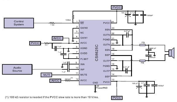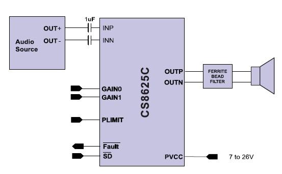CS8625C內(nèi)置了過流保護(hù),短路保護(hù)和過熱保護(hù),有效的保護(hù)芯片在異常的工作條件下不被損壞。CS8625C可以驅(qū)動(dòng)低至4Ω負(fù)載的揚(yáng)聲器,高達(dá)90%的效率,使得在播放音樂的時(shí)候不需要額外的散熱器。