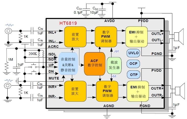 HT6819的防削頂失真功能可檢測并抑制由于音樂、語音信號幅度過大或電池電壓下降所引起的輸出削頂失真(破音),顯著提高音質,創造舒適的聽音享受,并保護揚聲器免受過載損壞。通過在ACRC端外接不同電阻電容值,可靈活設置放大器的音質和輸出功率;同時芯片提供了ACF Off模式