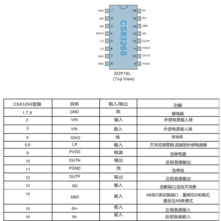 產品名稱: CS8326(內置BOOST升壓、恒定7.0W輸出功率、AB類/D類切換單聲道音頻功放IC)