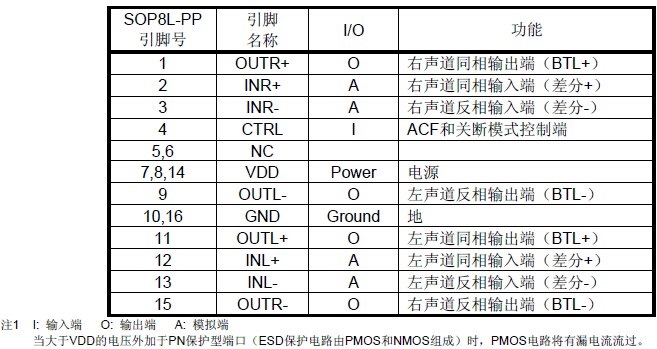 2×20W (VDD=14.5V, RL=4Ω, THD+N=1%) 或2×25W (VDD=14.5V, RL=4Ω, THD+N=10%) |