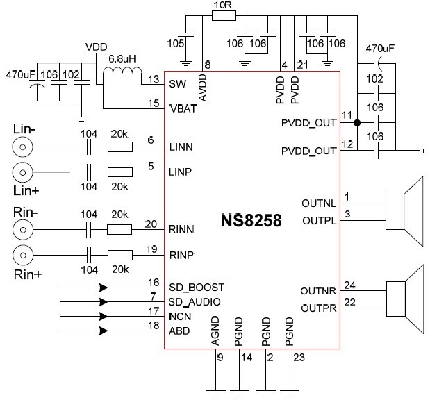 2X8.5W/2.7V-5.5V(內置自適應升壓模塊)/4Ω |