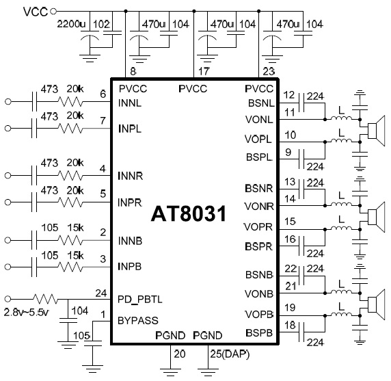 AT8031是一款單芯片2.1聲道 class D功放,內置三個通道的class D 功放,具有90%以上的效率,無需使用外置散熱片,外圍電路極其簡潔。AT8031可以支持5V~16V的電源電壓工作范圍,每個通道采用BTL的輸出模式,在左右聲道8歐姆負載,低音聲道4歐姆負載的條件下,最大可提供2X10W+20W的輸出功率,PBTL設計可以將左右兩個小功率聲道并聯成一個聲道,與低音通道一起組合成一個2X20W的立體聲功放。