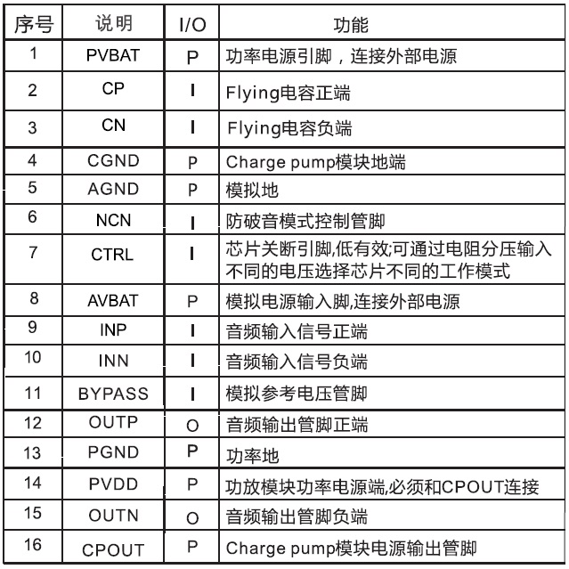 恒定4.8W/2.5V-5.5V(內置自適應Charge Pump模塊)/4Ω |