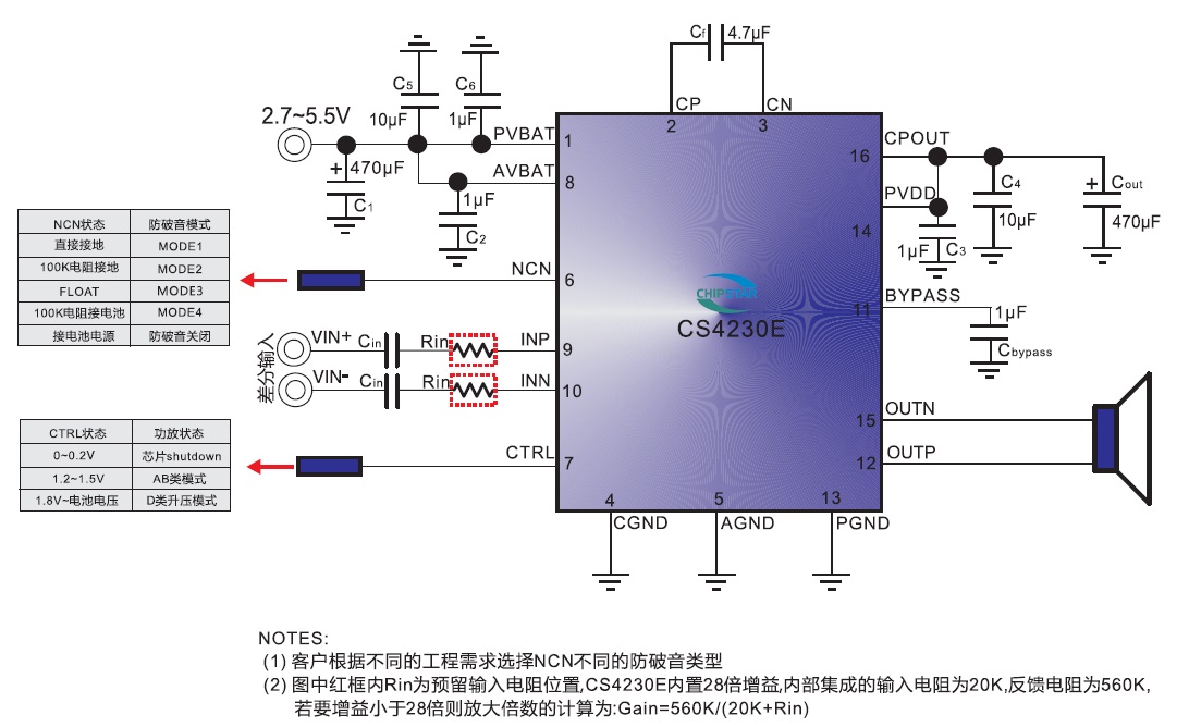 CS4230E是一款采用 CMOS工藝 ,電窯式升壓型 GF類單 聲道音頻功放,可以為4Ω的負載O供最高4.8W的連續功 率;CS4230E芯片內部固定的28倍增益,有效的減少了 外圍元器件的數量;功放集成了D類和AB類兩種工作模式 即可保證D類模式下強勁的功率輸出,又可兼顧系統在有 FM的情況下,消除功放對系統的干擾;CS4230E具有獨 特的防破音(NCN)功 能,可根據輸出信號的大小自動調整 功放的增益,實現更 舒適的昕覺感受,其4種防破音模式 的選擇為不同的工程要求O供了最大的挑選余地 ;另 外,CS4230E還具備電源自適應能力,當電源電壓低的時 候,功放會自動降低增益,從而減少功放的輸出功率.