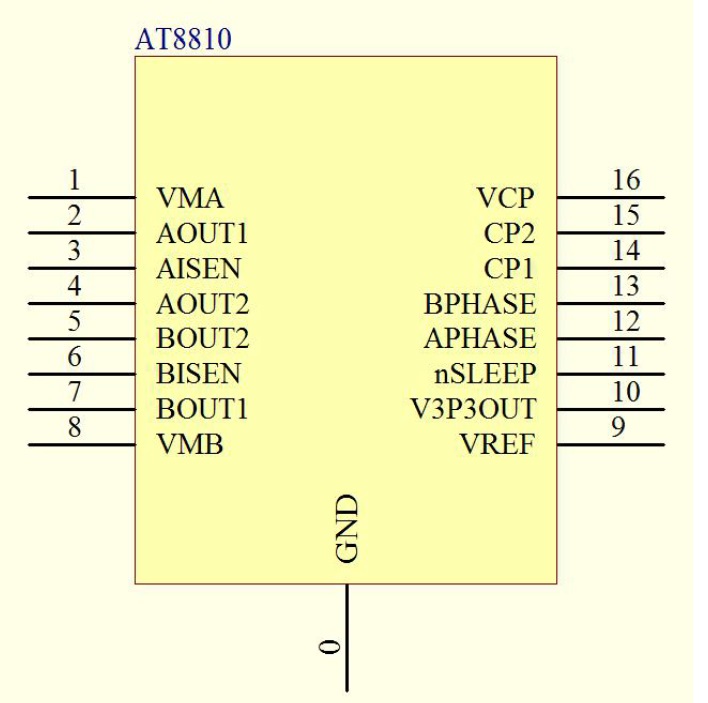 AT8810的每一個橋的功率輸出模塊由N型功率MOSFET組成,叫作H橋驅動器。每個橋包含整流電路和限流電路。簡單的并行數字控制接口。內部關斷功能包含過流保護,短路保護,欠壓鎖定保護和過溫保護。