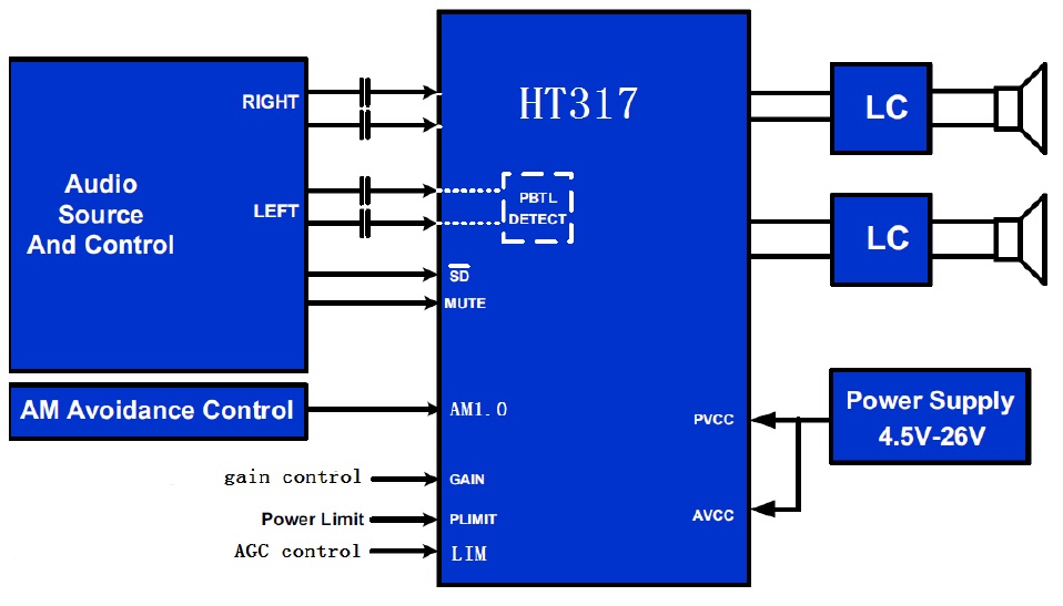HT317具有過溫限幅功能,當芯片內部溫度達到過溫限幅點,HT317自動降低增益,使其IC能夠連續播放而不間斷。另外,HT317具有功率限制功能,一種是限幅功能,在輸出端限制一定的輸出幅度,使其不損壞喇叭。另一種為AGC防削頂失真功能,開啟后,可有效改善因輸入幅度過大或者電源電壓降低造成的破音失真。