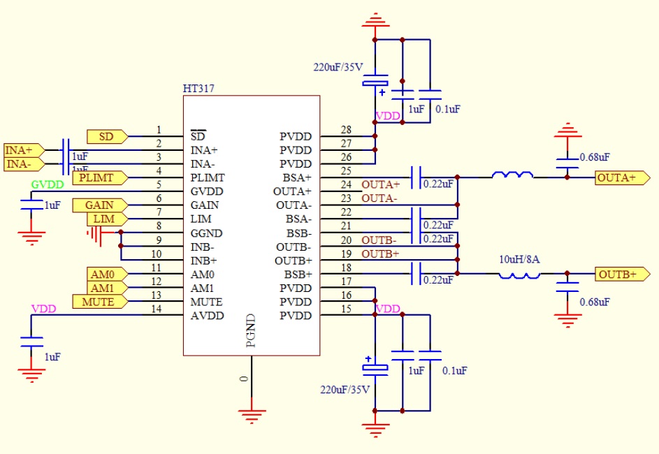 HT317是一款高效D類音頻功率放大器。在BTL模式,能夠提供2*30W/8Ω功率輸出;在PBTL模式,能夠提供75W/4Ω功率輸出。