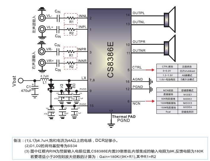 固定21倍增益,防破音,AB/D切換,電源自動增益調節,功率限制,多階電源自適應功能 內置BOOST升壓模塊,恒定10W輸出功率R類單聲道音頻功率放大器 |