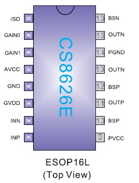 CS8626E提供纖小的ESOP16封裝形式供客戶選擇,可以為客戶節省可觀的PCB面積,其額定的工作溫度范圍為-40℃至85℃。