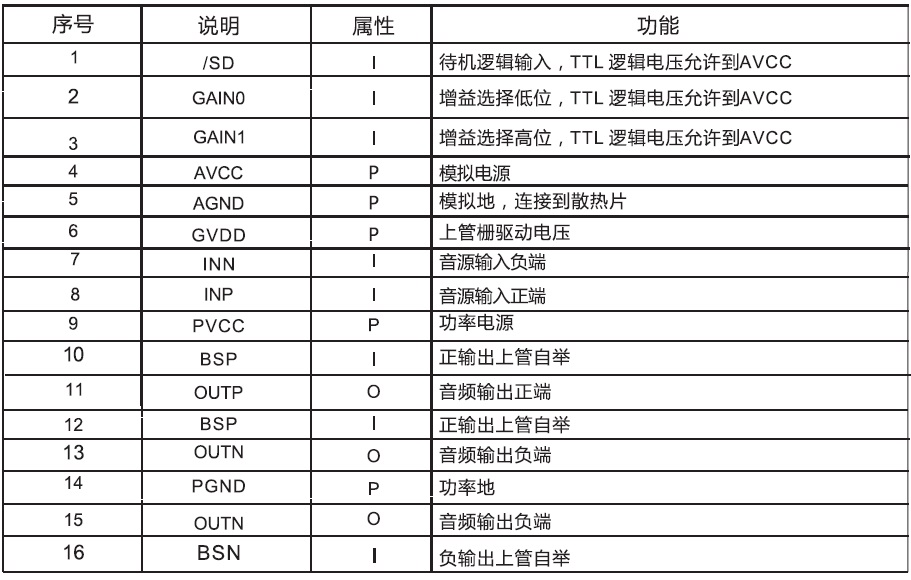 擴頻功能、低空載電流、40倍增益、免濾波、2X23W/33W(PBTL) D類音頻放大器 |