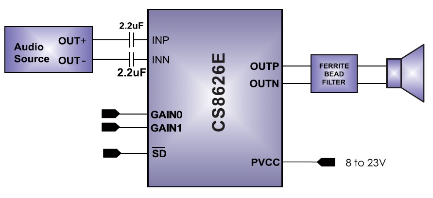 CS8626E是一款55W單聲道高效D類音頻功率放大電路。先進的EMI抑制技術使得在輸出端口采用廉價的鐵氧體磁珠濾波器就可以滿足EMC要求。CS8626E單通道音頻功率放大 器是為需要輸出高質量音頻功率的系統設計的,它采用表面貼裝技術,只需少量的外圍器件,便使系統具備高質量的音頻輸出功率。管腳兼容CS8622/CS8623,為客戶產品音質提升提供無縫切換的便利。