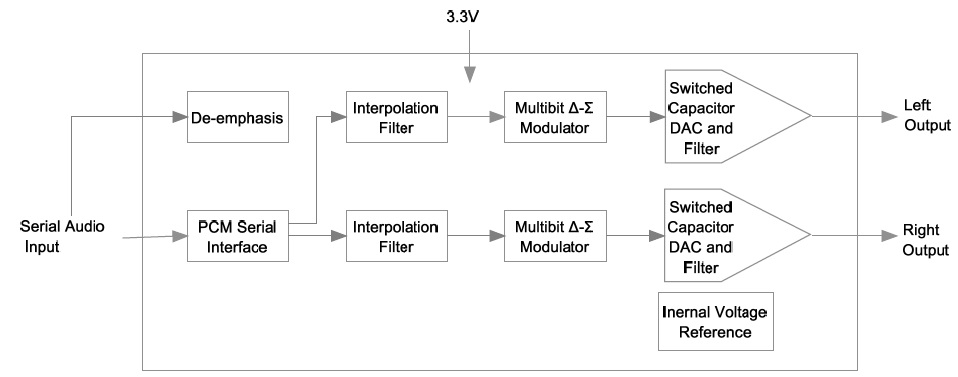 器,內(nèi)部集成了內(nèi)插濾波器、DA轉(zhuǎn)換器和輸出模擬