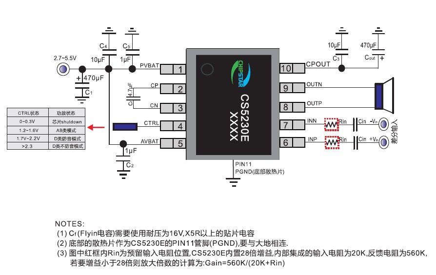 CS5230E是一款采用CMOS工藝,電容式升壓型GF類單聲道音頻功放,可以為4Ω的負載提供最高5W的連續功率;CS5230E芯片內部固定的28倍增益,有效的減少了外圍元器件的 數量;功放集成了D類和AB類兩種工作模式即可保證D類模式下強勁的功率輸出,又可兼顧系統在有FM的情況下,消除功放對系統的干擾;CS5230E具有獨特的防破音(NCN)功 能,可根據輸出信號的大小自動調整功放的增益,實現更加舒適的聽覺感受,CS5230E還具備電源自適應能力,當電源電壓低的時候,功放會自動降低增益,從而減少功放的輸出功率. CS5230E的外圍只有低成本的阻容器件,在以鋰電池供電的移動式音頻設備中,CS5230E是理想的音頻子系統的功放解決方案.CS5230E的全差分架構和極高的PSRR有 效地提高了CS5230E對RF噪聲的抑制 能力。另外CS5230E內置了過流保護,短路保護和過熱保護,有效的保護芯片在異常的工作條件下不被損壞。