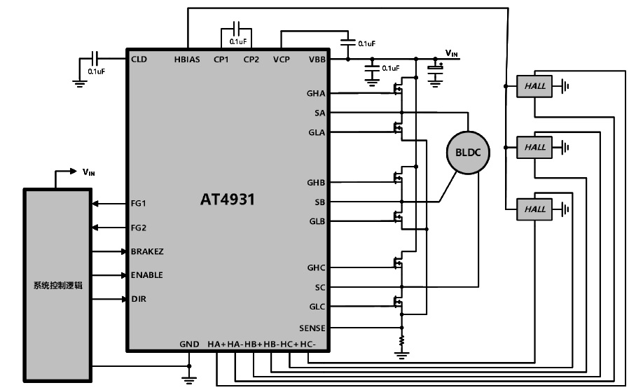 AT4931 是一款三相無刷直流電機(jī)預(yù)驅(qū)動(dòng)芯片,能夠在寬電壓范圍內(nèi)驅(qū)動(dòng)N 溝道功率MOSFET,且電機(jī)電源最高可支持到30V。換相邏輯由三個(gè)相位差為120°的霍爾元件確定。