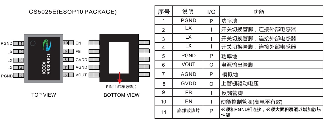 CS5025E提供了ESOP10的封裝類型,其額定的工作溫度范圍為-40℃至85℃。