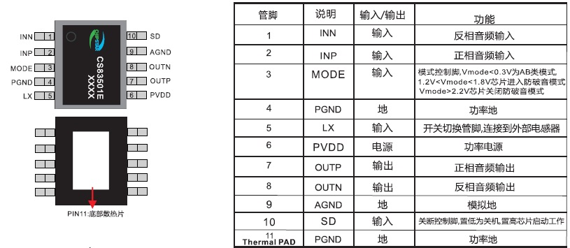 CS83501(自帶升壓單節(jié)鋰電恒定8W功率單聲道AB/D類切換音頻功放IC) |