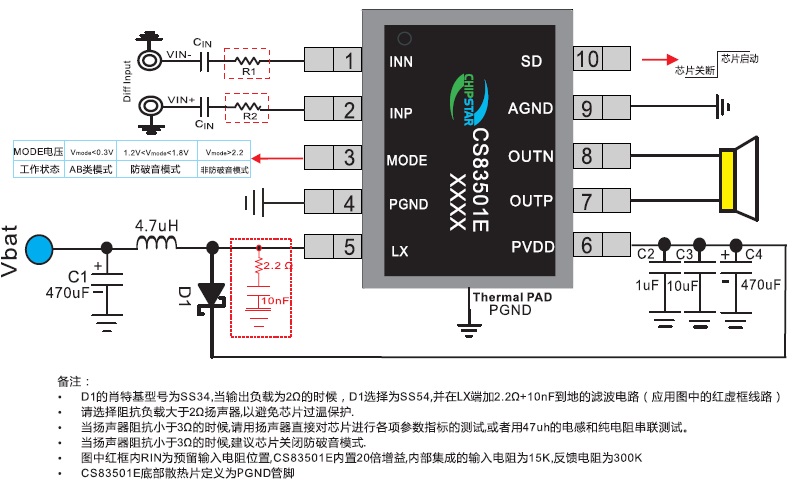 CS83501E的全差分架構和極高的PSRR有效地提高了CS83501E對RF噪聲的抑制能力。無需濾波器的PWM調制結構及內置的BOOST升壓模塊,以及CS83501E采用專有的AERC(Adaptive Edge Rate Control)技 術 ,在音頻全帶寬范圍內極大地降低了EMI的干擾,對60cm的音頻線,在FCC的標準下具有超過20dB的裕量,另外CS83501E內置了過流保 護,短路保護和過熱保護,有效的保護芯片在異常的工作條件下不被損壞。