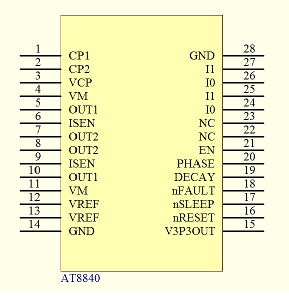 AT8840提供一種帶有裸露焊盤的TSSOP-28封裝,能有效改善散熱性能,且是無鉛產(chǎn)品,引腳框采用100%無錫電鍍。管腳功能兼容DRV8840,采用TSSOP-28封裝形式。