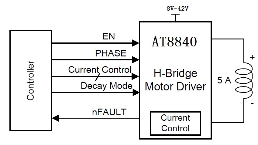 AT8840的功率輸出模塊由N型功率MOSFET組成,叫作H橋驅(qū)動器。H橋包含整流電路和限流電路。簡單的并行數(shù)字控制接口,衰減模式可編程。