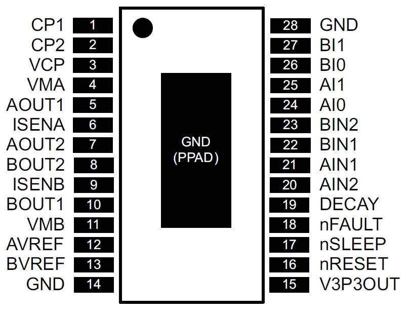 AT8841提供一種帶有裸露焊盤的TSSOP-28封裝,能有效改善散熱性能,且是無鉛產品,引腳框采用100%無錫電鍍。管腳功能兼容DRV8841,采用TSSOP-28封裝形式。