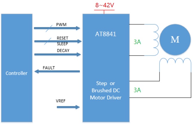 AT8841為打印機和其它電機一體化應用提供一種雙通道集成電機驅動方案。AT8841有兩路H橋驅動,最大輸出42V 3A,可驅動兩路刷式直流電機,或者一路雙極步進電機,或者螺線管或者其它感性負載。雙極步進電機可以以整步、2細分、4細分運行,或者用軟件實現高細分。