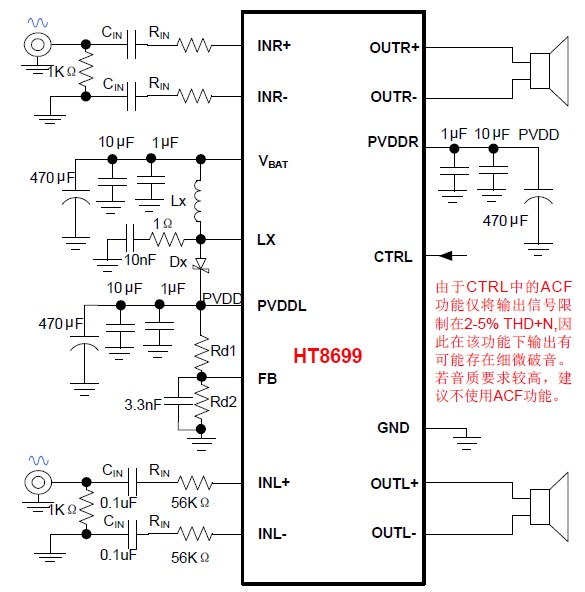 內置高效率自適應電荷泵升壓,防削頂失真功能,D/AB切換的5.5W單聲道高保真音頻功率放大器 |