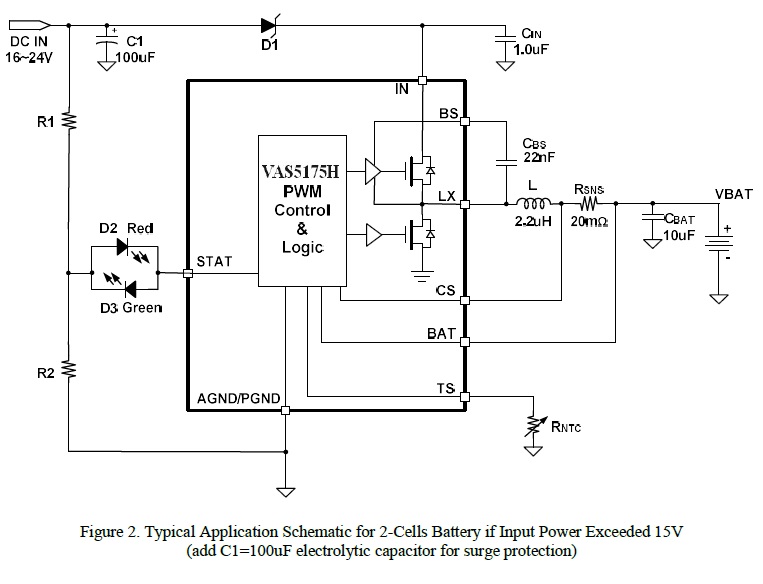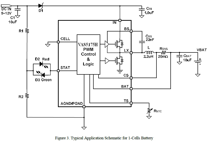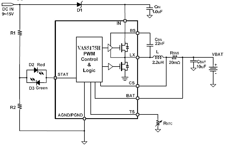 產品功能: VAS5175H 是一款5V-24V 輸入,開關降壓型1節4.35V/2節8.7V鋰離子/聚合物電池充電芯片, 以高精度調節2A 充電電流,和電池電壓。它密切監測電池組的溫度只在設置安全溫度范圍下允許充電,還提供電池檢測、預充電調節、充電飽充和充電狀態指示等功能。