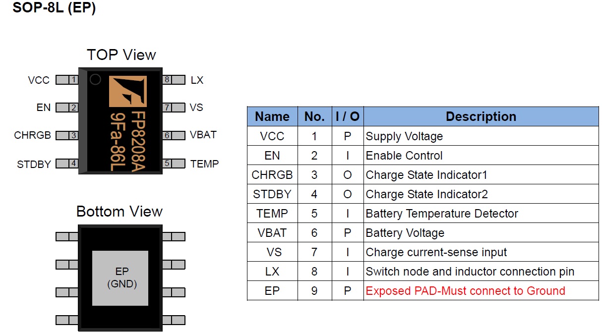 FP8208 FP8208A 是一款開關(guān)模式降壓型鋰電池充電管理芯片,輸入電壓應(yīng)用適合5V 交流適配器,可對單節(jié)鋰離子電池進(jìn)行定電流或是恒壓充電,其最大充電電流為3.5A,最大充電電流可由外部電阻進(jìn)行設(shè)定 ESOP-8 4.8V-5.5V 3.5A開關(guān)降壓型4.2V單節(jié)鋰電池充電IC