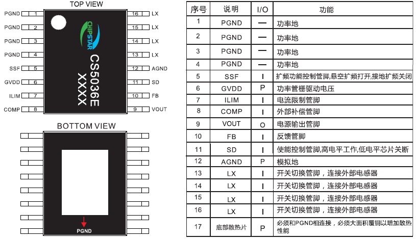 CS5036 輸入電壓:3-12V;輸出電壓最高可提供13V恒定的電壓輸出;最大可保證12A的峰值電流下 EQA-16 3V-12V 內置MOS,12A高效率升壓DC-DC轉換器